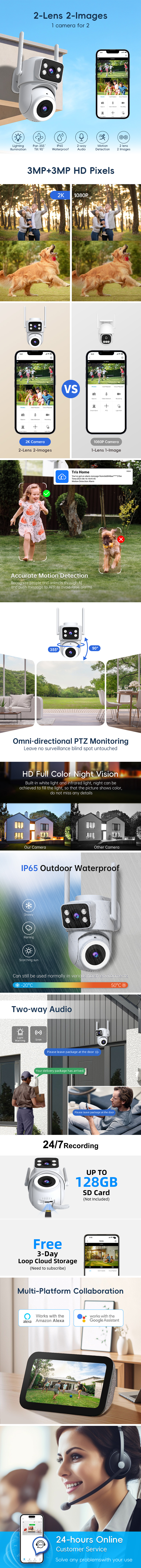 摄像头配备双镜头(3MP+3MP),实现 “一台设备双画面”,扩展监控视野,相比单镜头 1080P 摄像头覆盖更全面。